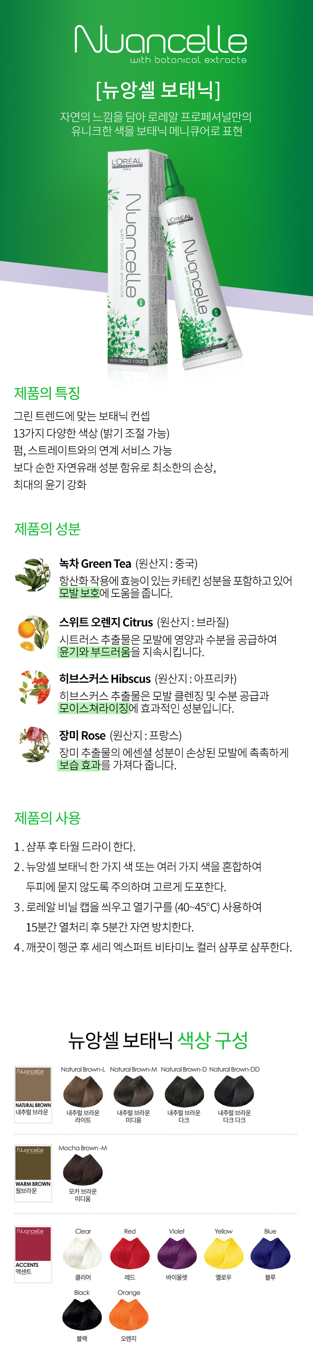 그린 트렌드에 맞는 보태닉 컨셉 / 20가지 다양한 색상(밝기 조절 가능) / 펌, 스트레이트와의 연계 서비스 가능 / 보다 순한 자연유래 성분 함유로 최소한의 손상, 최대의 윤기 강화